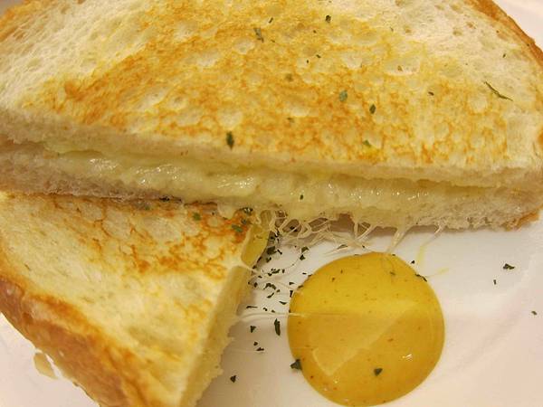 起司因為熱而融化,將兩片土司緊緊黏在一起,裡面的起司很多,會有些許牽絲的感覺,一定得熱熱吃,